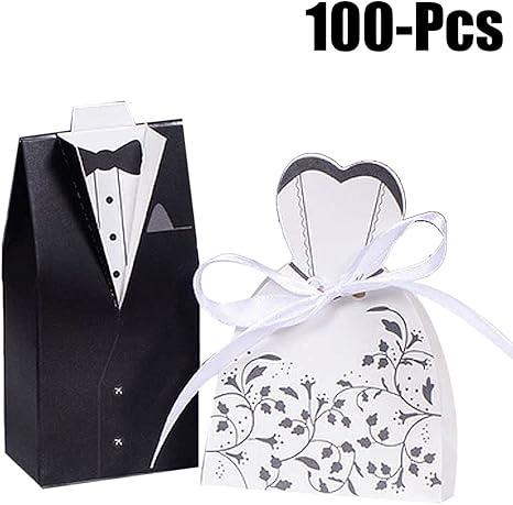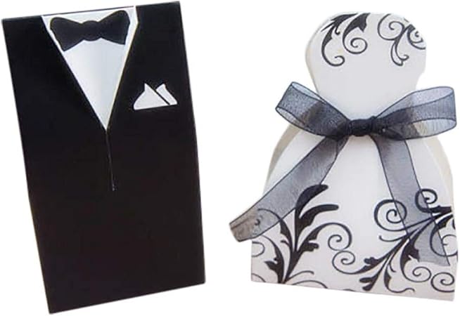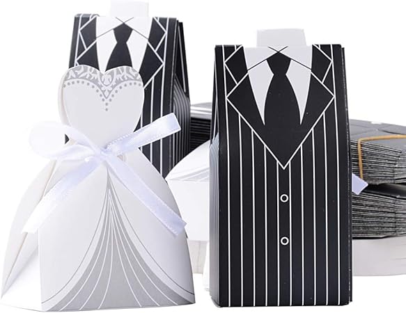 Betessin 100pcs Boite A Dragees Bonbonnieres Couple Forme 50 Mariees Et 50 Maries Boite Cadeaux Pour Invites De Fiancailles Decoration De Mariage Fete Robe Costume Raye Amazon Fr Cuisine Maison
