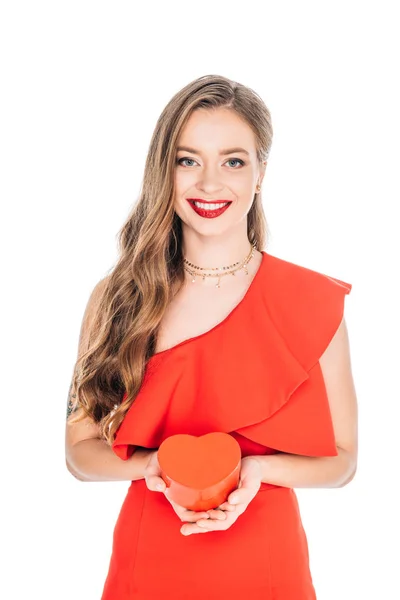 Photo Libre De Droit De Belle Souriante Dans Une Robe Rouge Avec Une Boite Cadeau En Forme De Coeur Banque D Images Et Plus D Images Libres De Droit De Adulte Istock