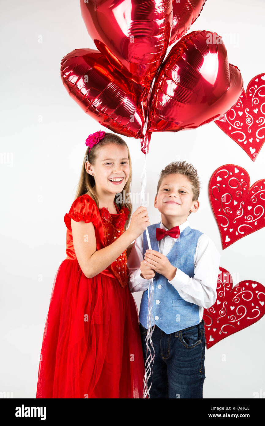 Saint Valentine S Day Jolie Fille Avec Robe Rouge Et Gentleman Garcon Avec Gilet Bleu Rouge Cravate Papillon Roses Rouges En Forme De Coeur Et Godet Boite Cadeau Va Photo Stock Alamy
