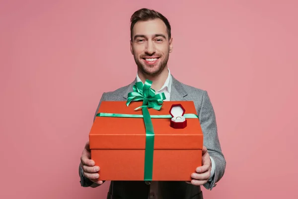 Jeune Homme En Costume Jeans Montrant Les Boites Presentes Photo Gratuite
