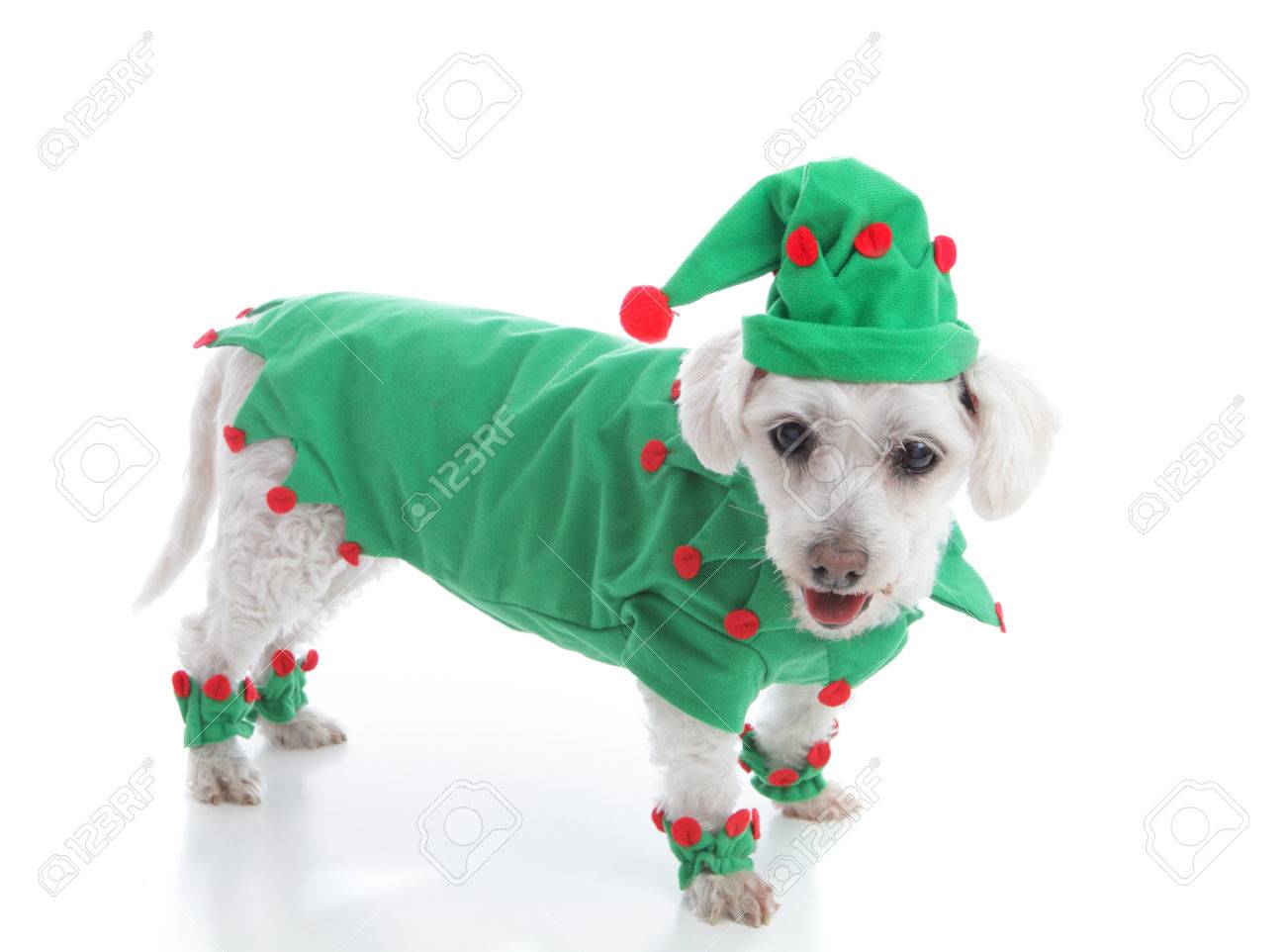 Chien De Race Mixte Chihuahua Drole Debout Sur Blanc Portant Costume De Lutin De Noel Rouge Et Vert Banque D Images Et Photos Libres De Droits Image 93247247
