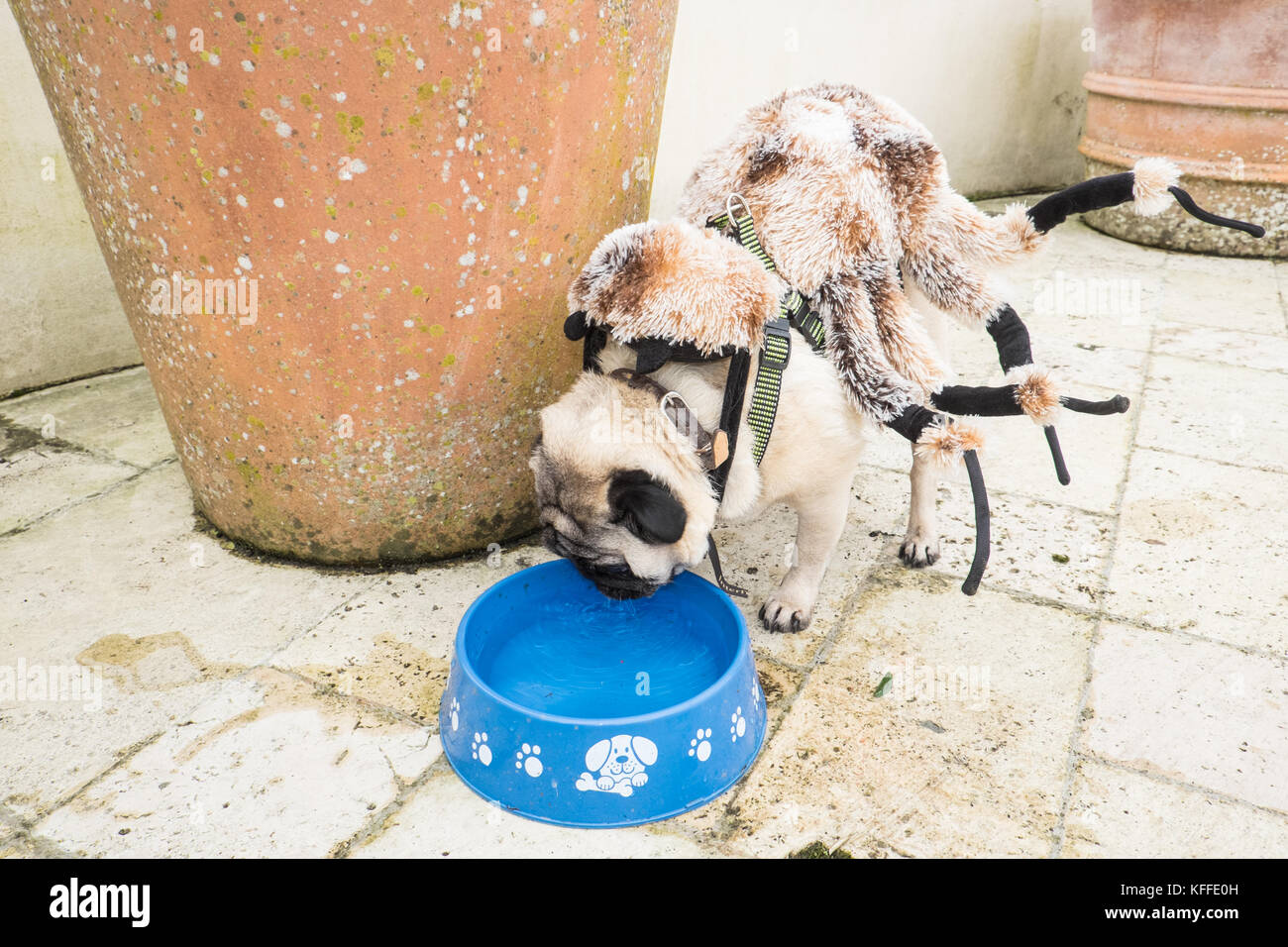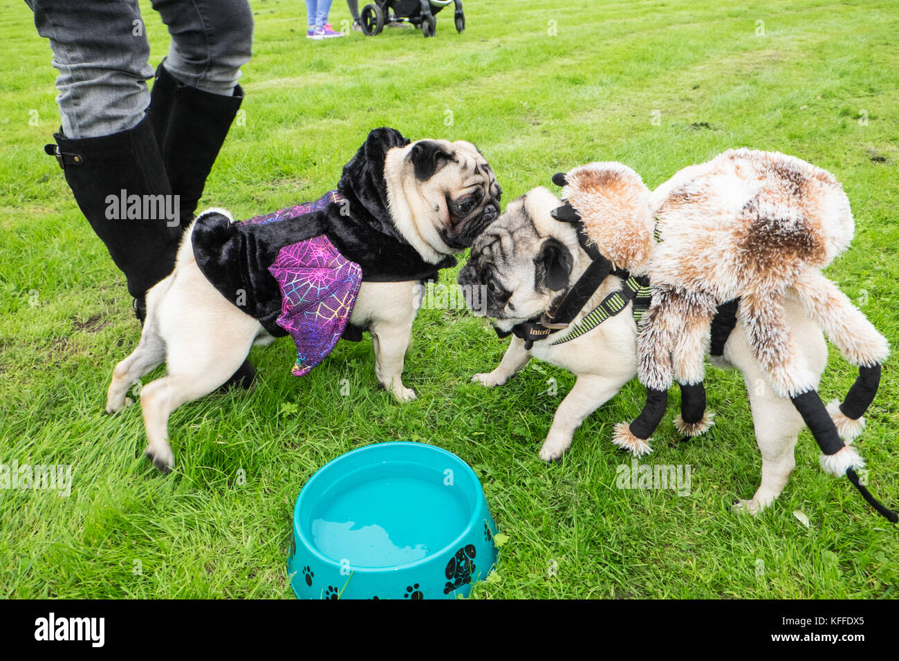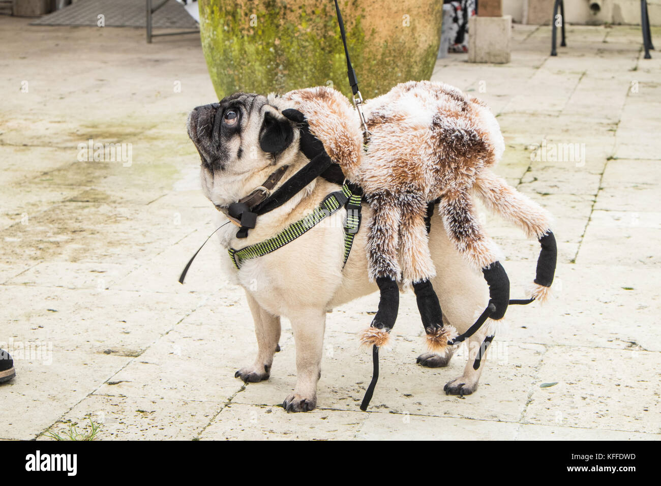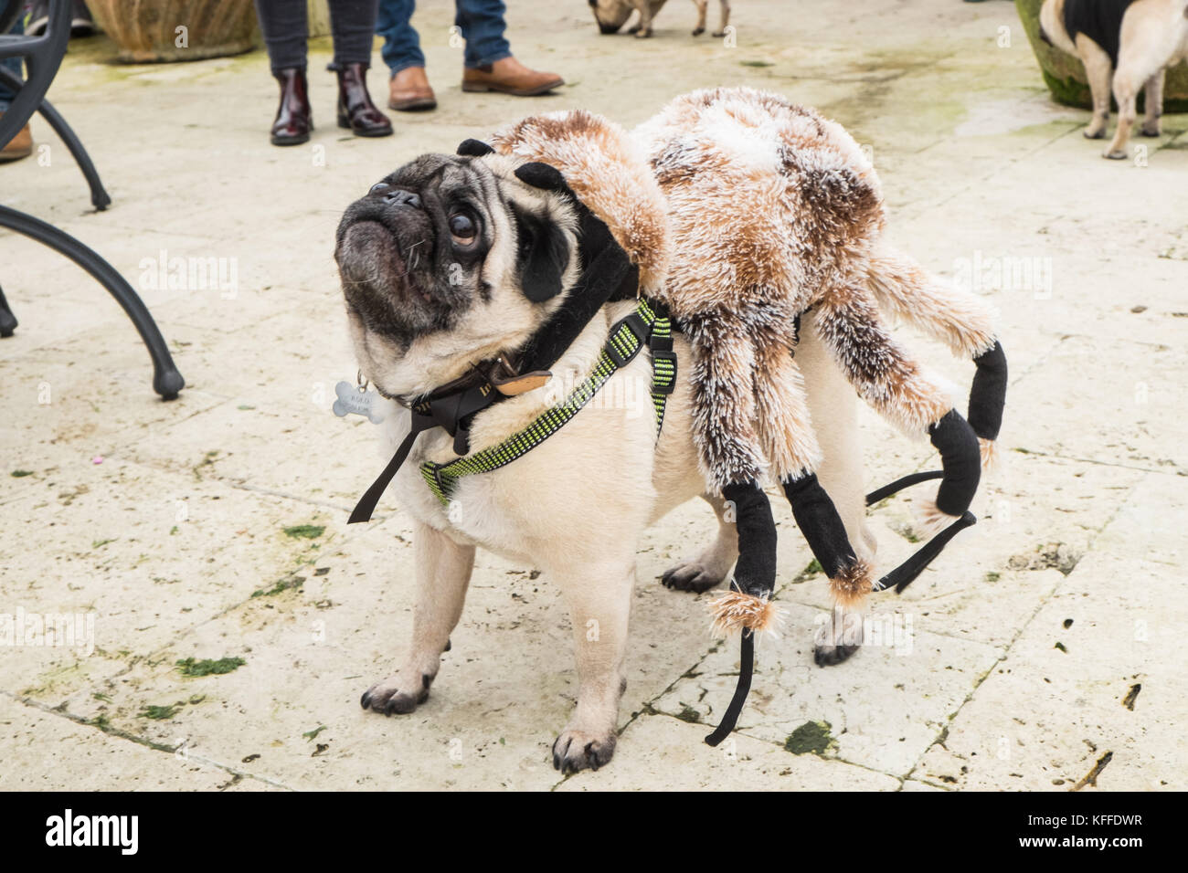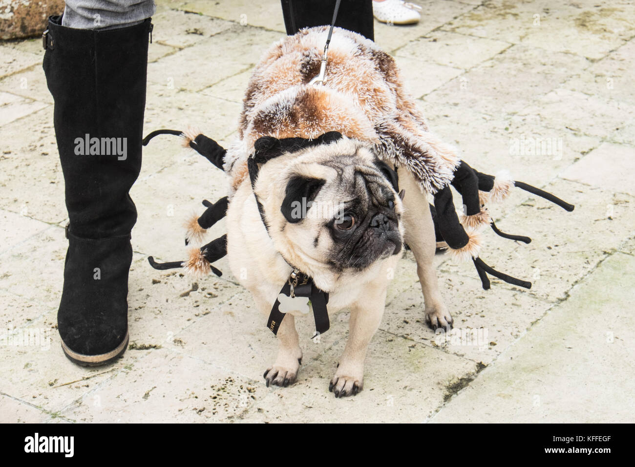 Laugharne Carmarthenshire Pays De Galles Royaume Uni 28 Oct 2017 Arlo Un Chien Pug De 6 Transportant Une Araignee Et Gagnant Du Meilleur Chien Habille En Pugfest Evenement Halloween Tenue A Corran Resort Et Spa Laugharne