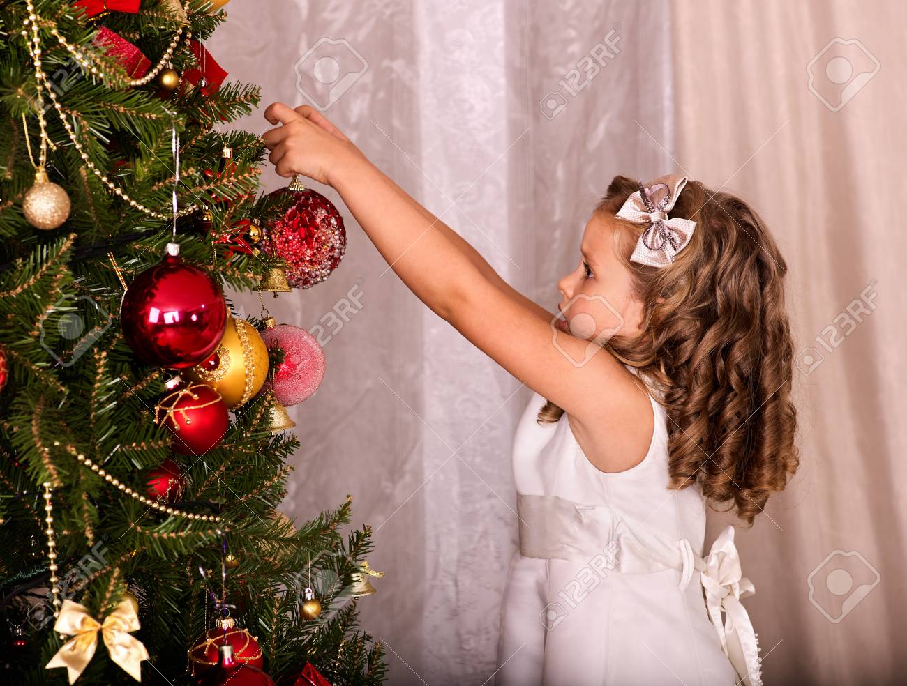 Enfant Decorer Le Sapin De Noel Petite Fille Se Habiller Boule De Noel Banque D Images Et Photos Libres De Droits Image 64229496