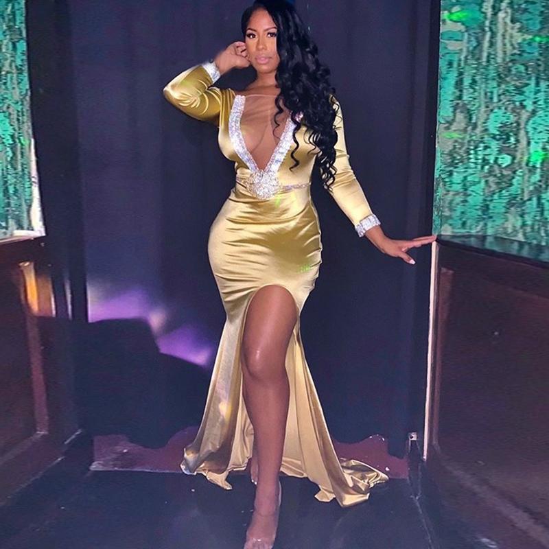 Acheter Femme Robe Habillee Sexy Pour Femmes Vetements Robes De Soiree Manches Longues Col En V Diner Brillant Robes De Couleur Unie 49 De 11 15 Du Bossbaby Dhgate Com