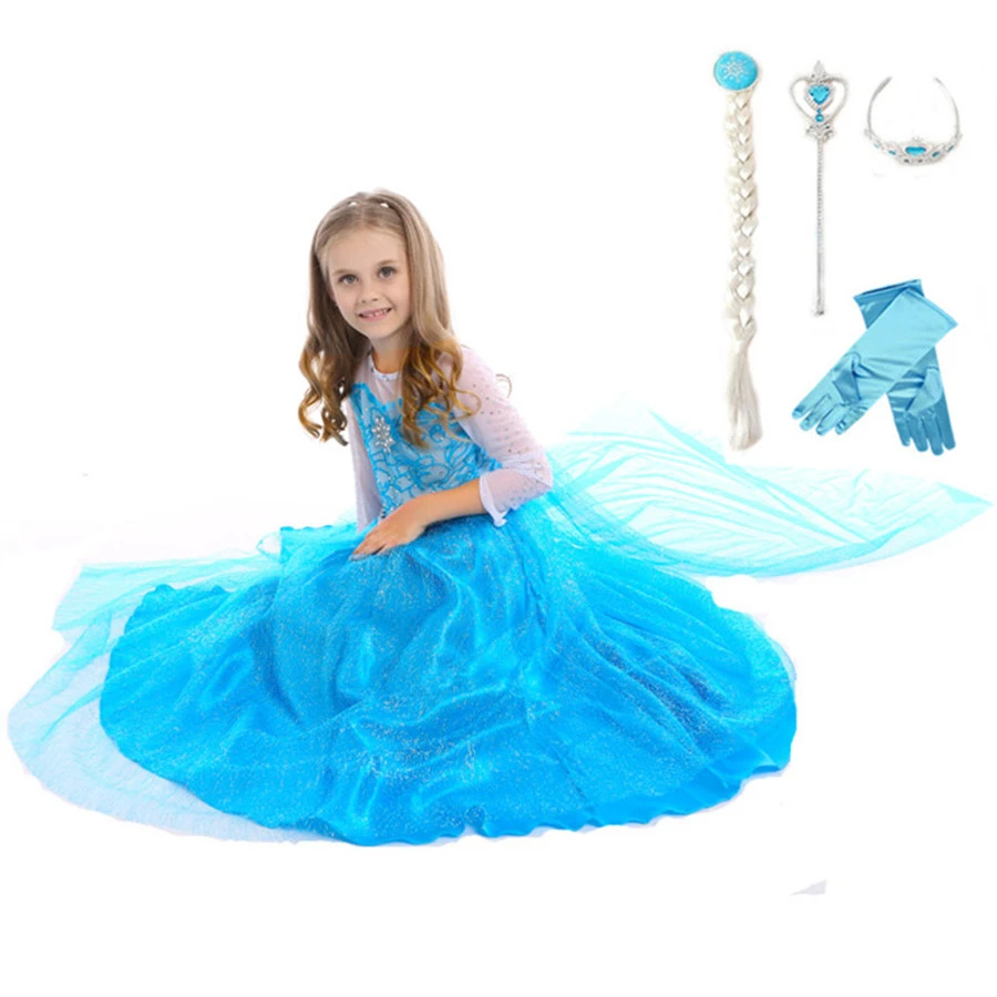 Robe Elsa Reine Bleue Avec Cape 3 8t Tenue Princesse De Fete Pour Petites Filles Vetements De Noel Cosplay Baguette Magique Tressee Avec Couronne Aliexpress