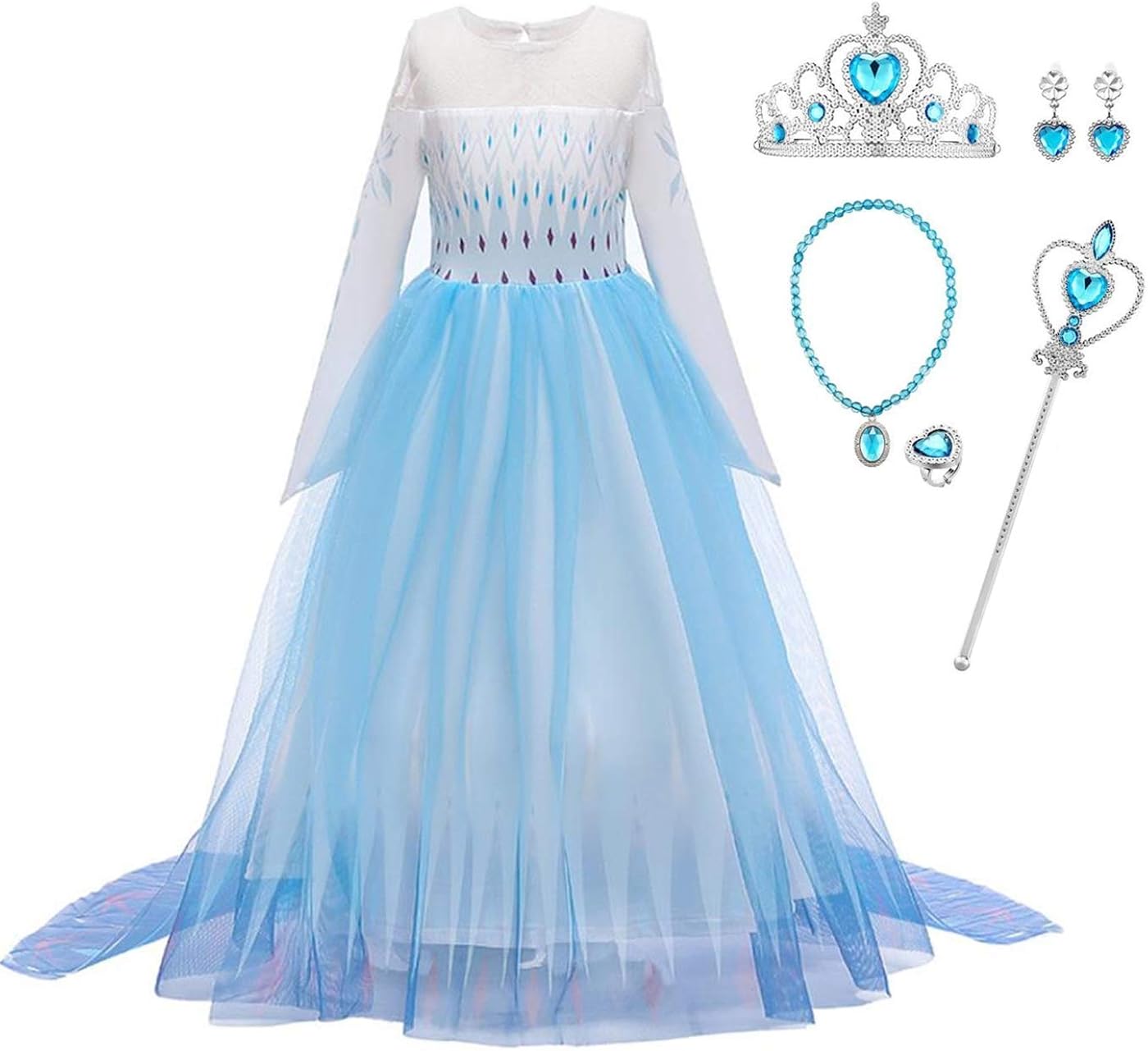 Iwfree Petites Filles Robe Longue Deguisements Manches Longues Princesse Elsa Reine Des Neiges Costume Et Accessoires Diademe Gants Baguette Magique Et Tresse Bleu Robe De Soiree Enfants Jeux D Imitation