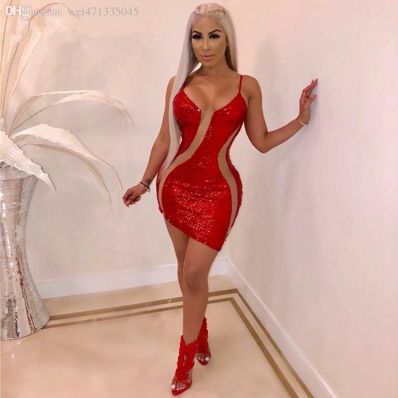Acheter Crazy2019 Glitter Paillettes Robe Moulante Robes Danniversaire Femmes Sexy Voir A Travers Mesh Rouge Robe De Fete De Noel En Gros De 43 04 Du Tikoy Dhgate Com