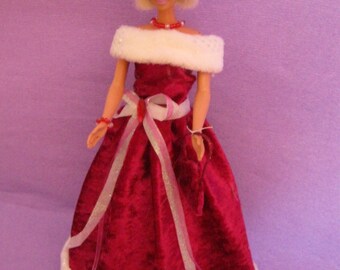 Robe Longue Mere Noel Avec Fausse Fourrure Col Bateau Manches Longues Elegant Rouge Et Blanc Robes