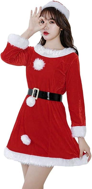 Yumso Femme Robe Col Rond Hiver Noel Velours Tutu Robe Deguisement De Mme Noel Santa Soiree Claus Pour Femme Avec Une Magnifique Ceinture Rouge Manches Longues Mini Robe M L Amazon Fr Vetements Et