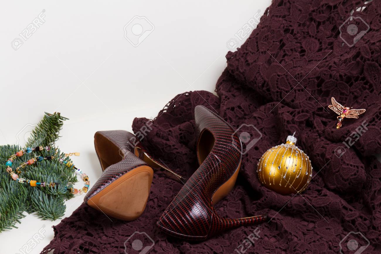 Paire De Chaussures A Talons Hauts Et Elegante Robe A Lacets Pour La Fete De Noel Banque D Images Et Photos Libres De Droits Image 91211110