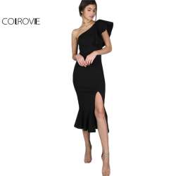 Prix Colrovie Noir Parti Robe 2017 Femmes Une Epaule A Volants Peplum Hem Sexy Elegant Robes D Ete Mince Ruche Scission Moulante Robe Site Chinois Moins Cher