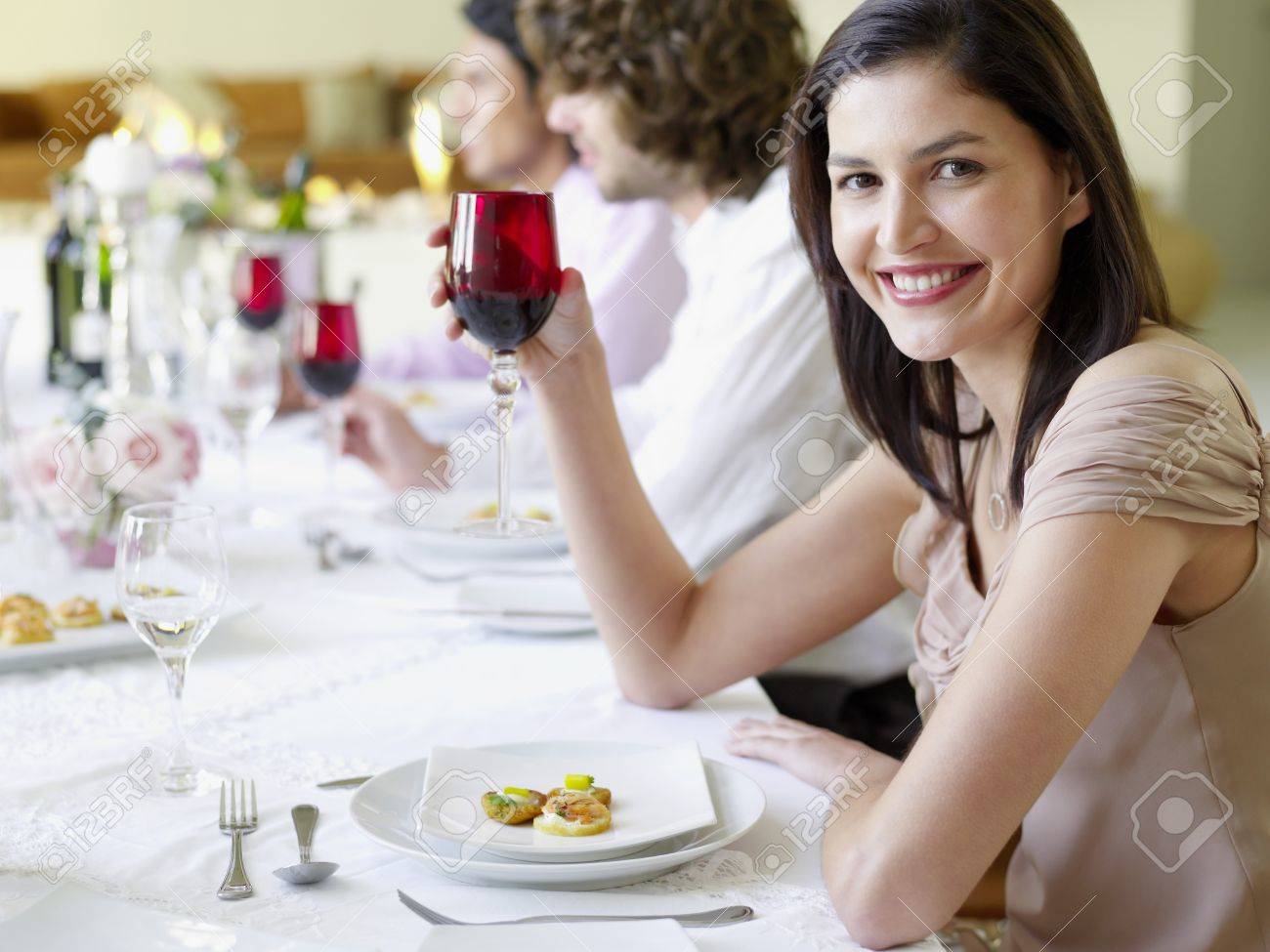 Jeune Femme En Robe Assis A Table Verre A Vin De Detention Au Diner De Vue De Cote Formel Banque D Images Et Photos Libres De Droits Image 19521872