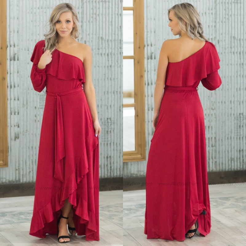 Robe Longue Rouge Coupe Sirene Une Manche En 2020 Robe Demoiselle D Honneur Robe Formelle Idees Vestimentaires