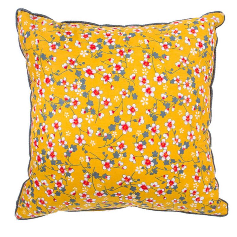 Coussin Carre Dehoussable Jaune Moutarde Et Fleurs Cerisiers