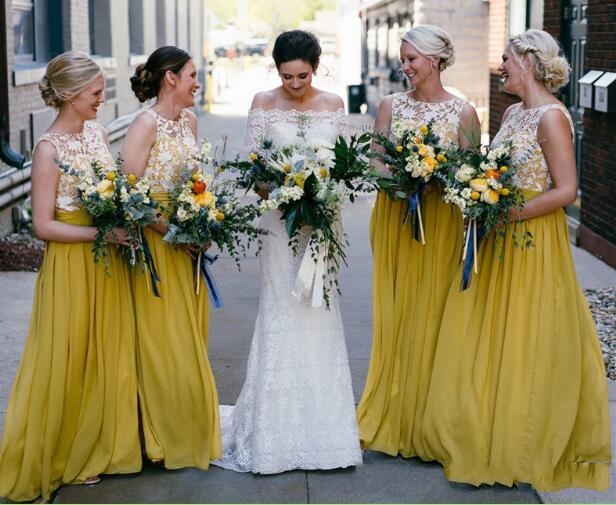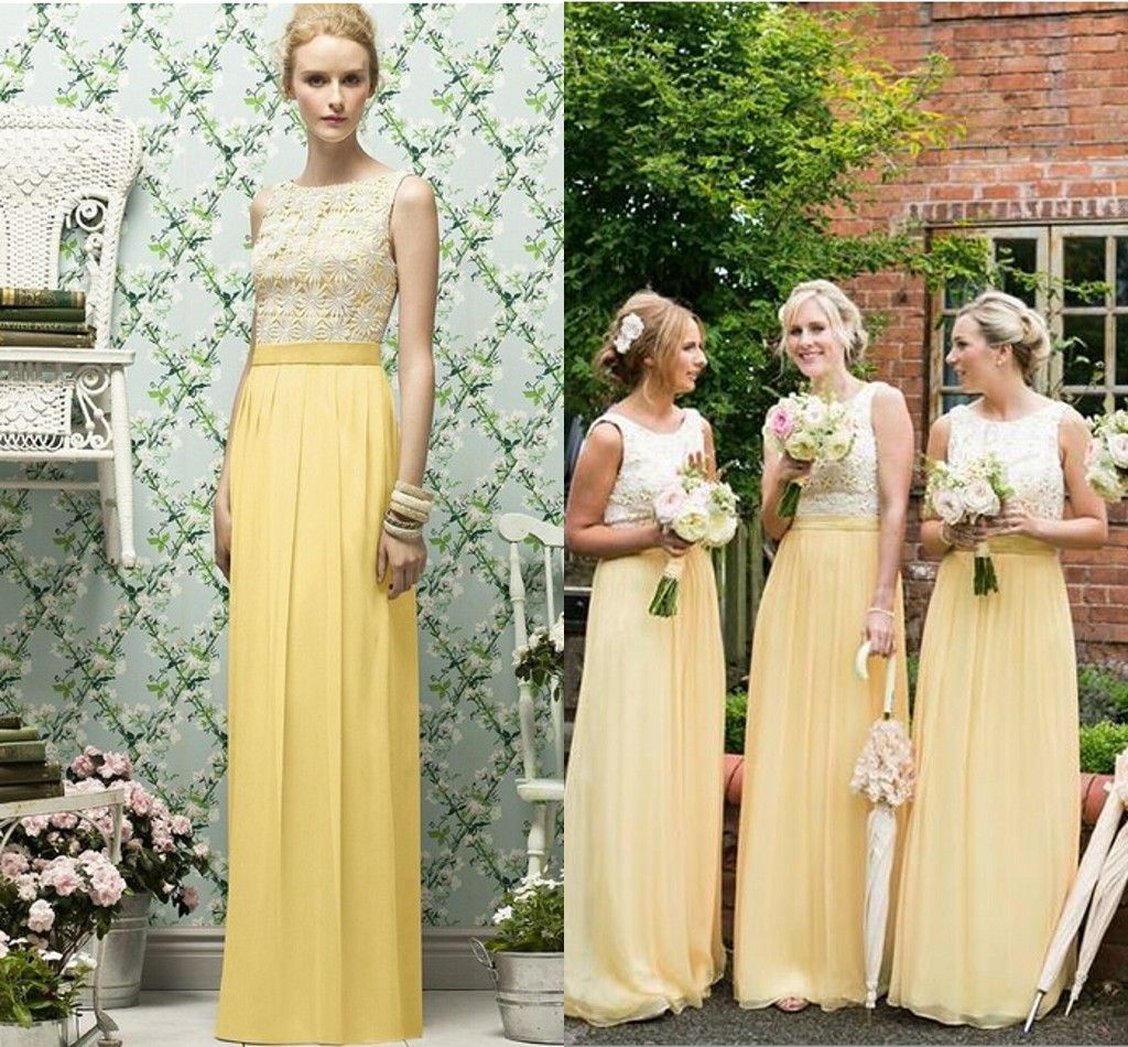 Acheter Robes De Demoiselle Dhonneur Longues Jaune En Mousseline De Soie Longueur De Plancher Sans Manches En Dentelle Haut Custom Made Plage Demoiselle Dhonneur Robes Pour Mariage De 49 31 Du Blissbridal