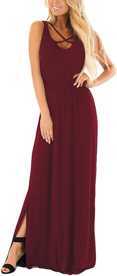 Bequemer Laden Robe Longue Femme Sans Manches Ete Racerback Loose Uni Maxi Robe Casual Robe De