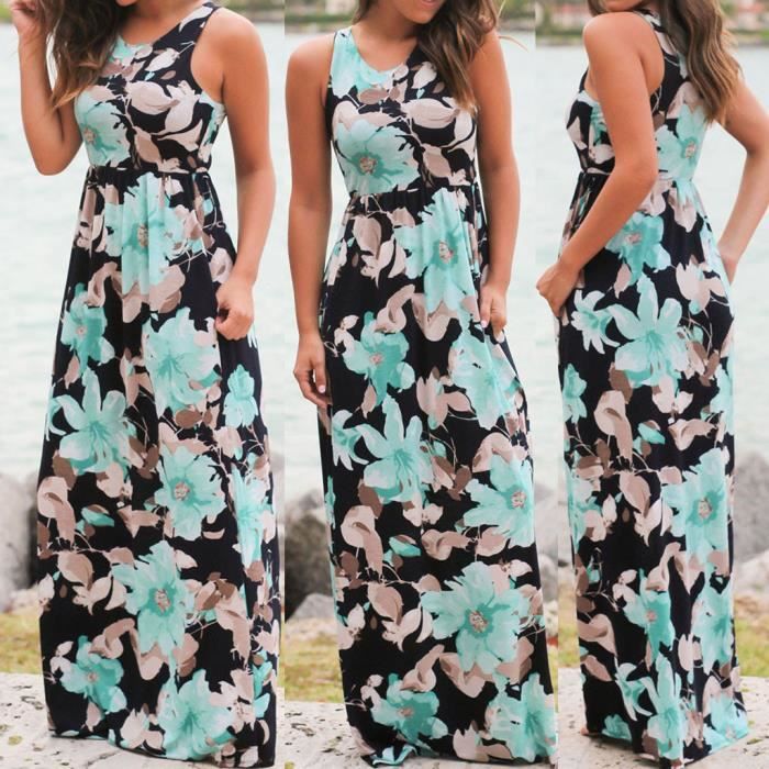 Robe Maxi Sans Manches A Imprime Floral Pour Femme Avec Poches Robe Longue De Plage Bleu Yuanliae2020 Bleu Achat Vente Robe De Plage Cdiscount