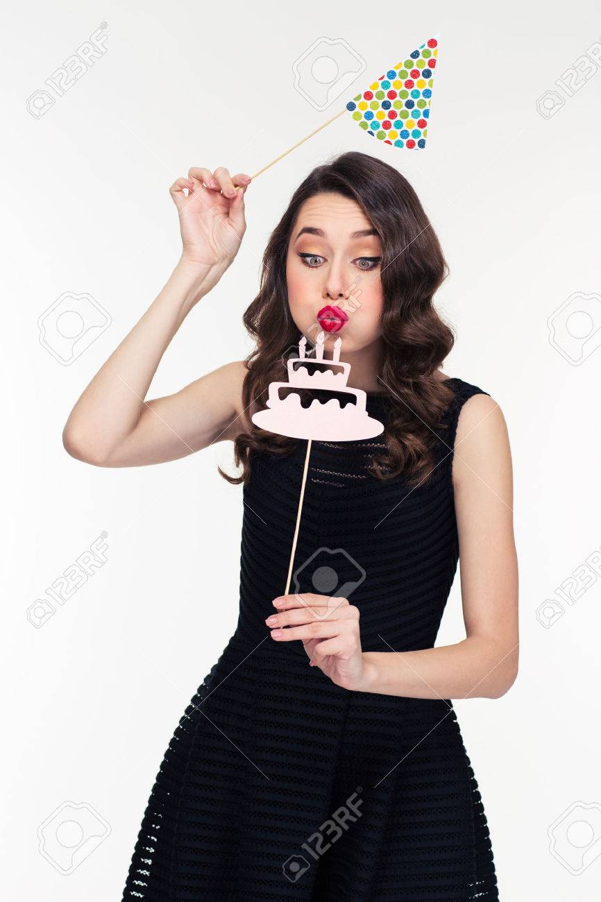 Mignon Belle Retro Boucles Style Jeune Femme En Robe Noire Soufflant Sur Le Gateau D Anniversaire Avec Des Bougies Faux Accessoires Et La Tenue De Stand De Chapeau D Anniversaire Sur Fond Blanc Banque