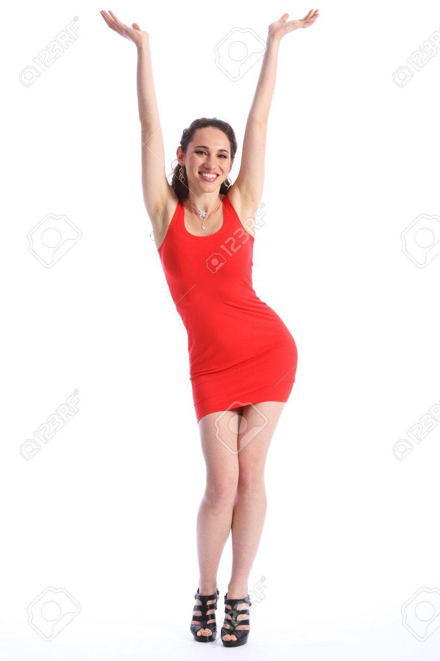 Celebrer Le Succes Avec Les Mains En L Air Pour La Belle Mannequin Femme Sexy Vetue De Noir Chaussures A Talons Hauts Et Une Robe Courte Rouge Sur Toute La Longueur Tire Contre