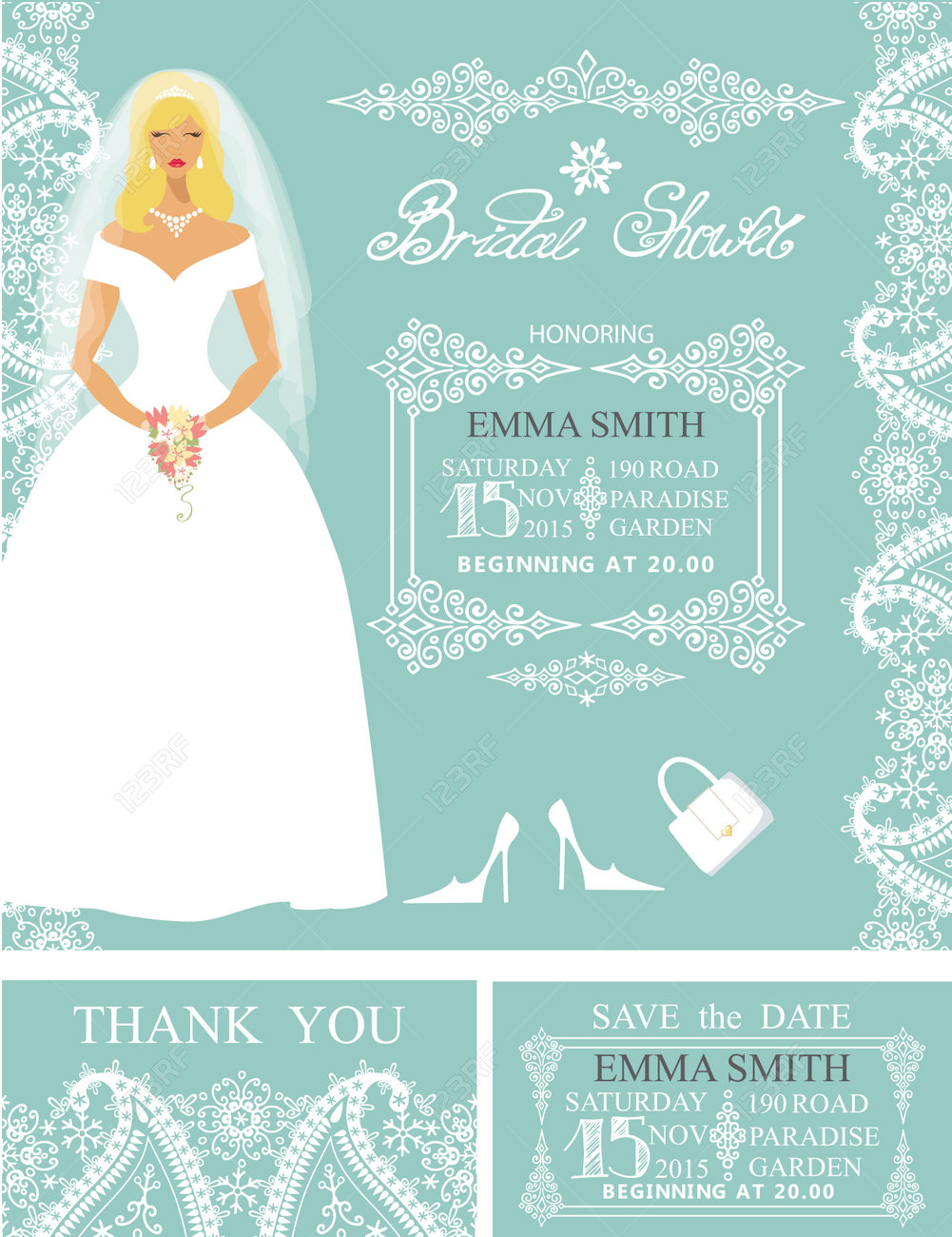Mariage Invitation Nuptiale De Douche Set Beautiful Mariee En Robe De Mariee Pisley Bordure En Dentelle Le Titre De Lettrage Retro Saison Design Winter Enregistrer La Carte De Date Je Vous Remercie Card Holiday Vector