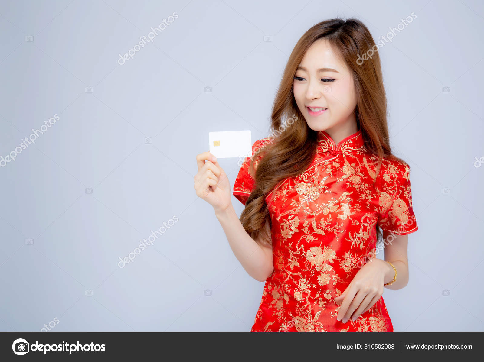 Happy Asian Fille En Chinois Cheongsam Robe Avec Un Cadeau Photographie Nnudoo C 310502008