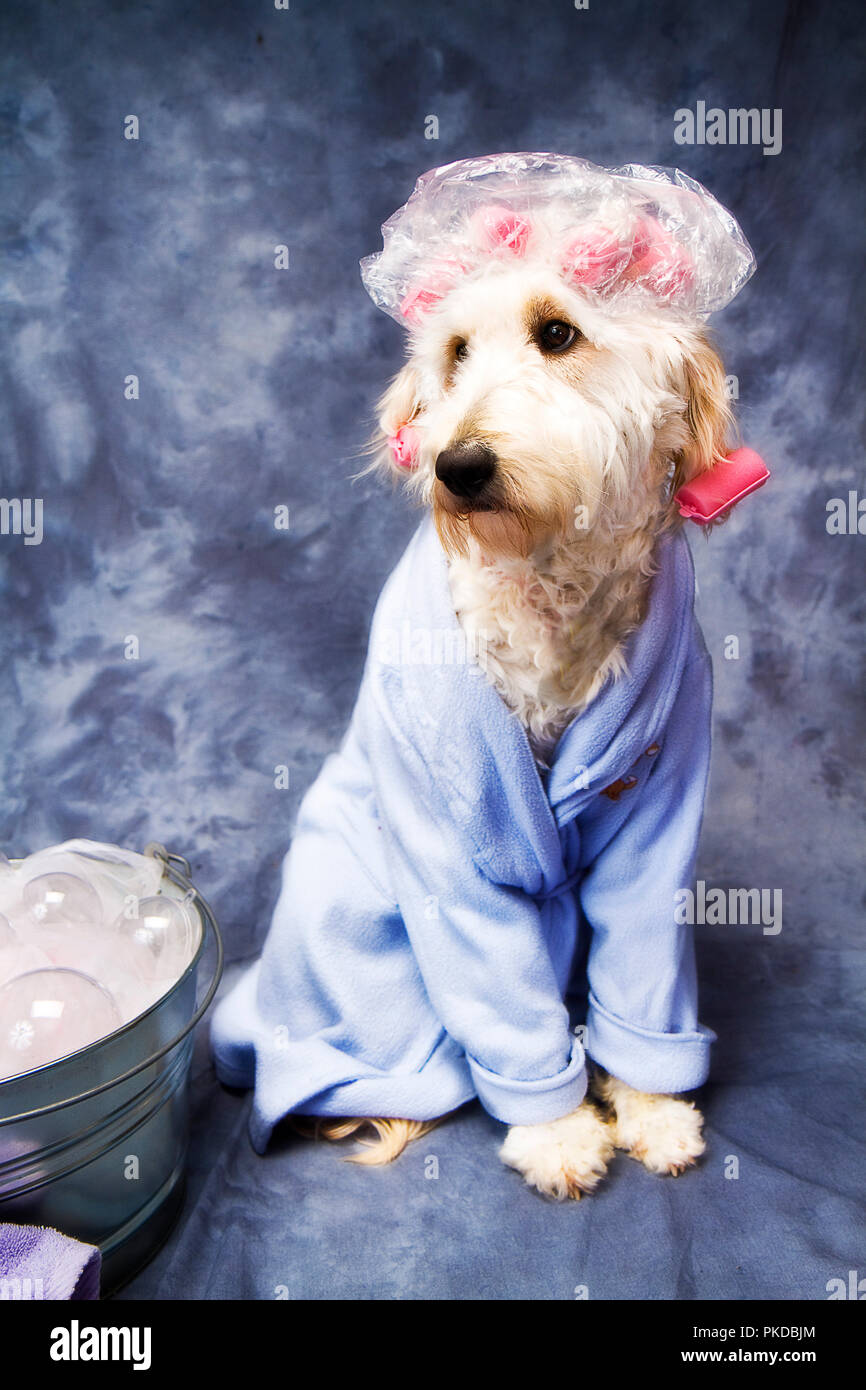 Chien Golden Doodle Dans Divers Images Concept Y Compris Robe Up Pour Le The L Apres Midi Et Plus Photo Stock Alamy