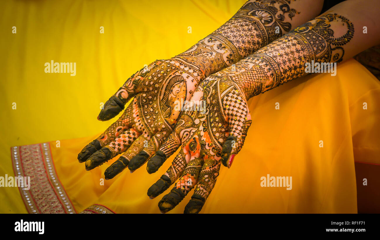 Peinture Au Henne Mehendi Mariee Sur Ses Mains Avec De L Arriere Plan Robe Jaune Preparation De Mariage En Inde Photo Stock Alamy