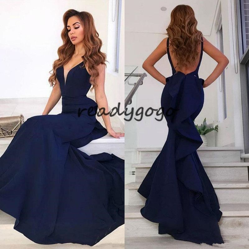 Acheter Sexy Bleu Marine Sirene De Bal Robes Longue Col En V Dos Nu Balayage Train Ruffles Plus La Taille Satin Soiree Robe De Soiree Formelle Robes De Soiree De 92 21