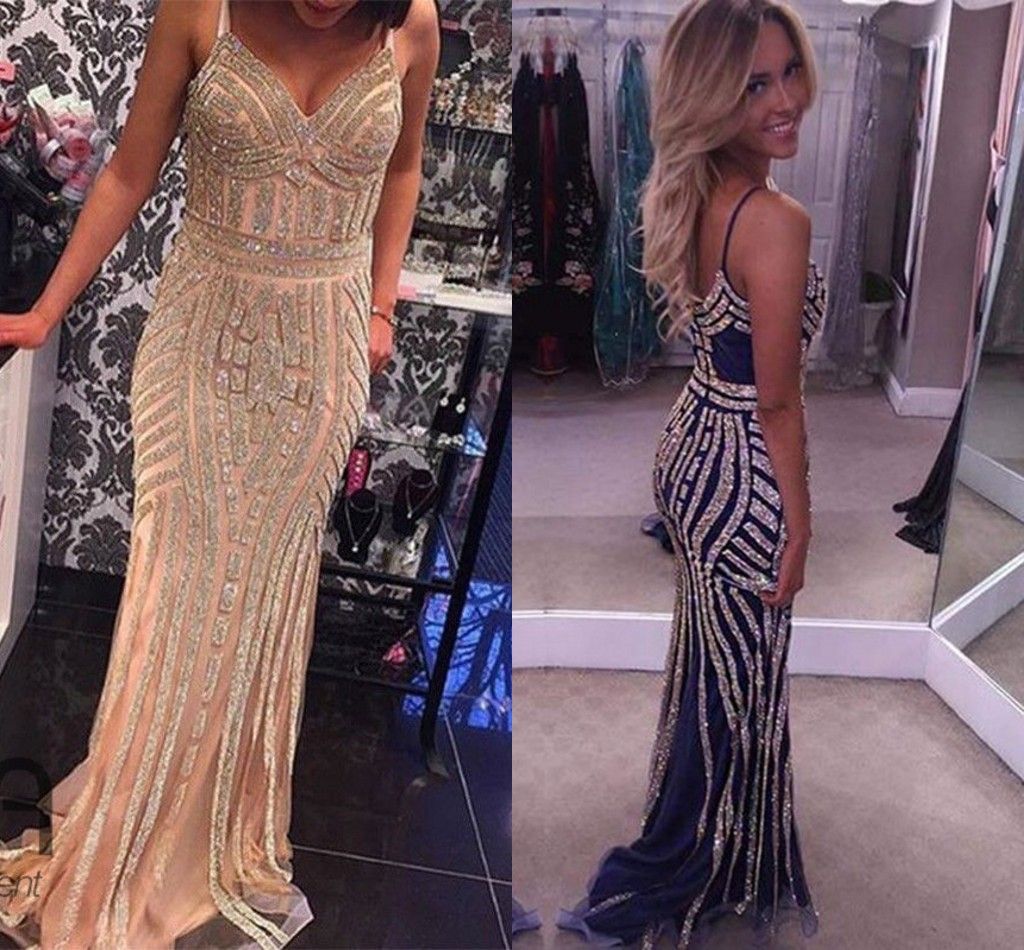 Acheter Robes De Soiree Sirene Bleu Marine De Luxe V Cou Bretelles Spaghetti Cristaux Cristaux De Tulle Dos Nu Brillant Argent Or Robes De Bal Sexy Robes De Soiree De 129 13