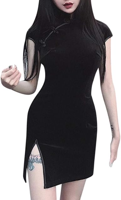 Luckycat Gothique Robe Chinoise De Cheongsam Pour Femme Velours Robe Chinoise De Femme A Manches Courtes Collier De Haute Hendidura Impression Qipao Fete De Mariage Nuit Robe Pyjama Sexy Noir
