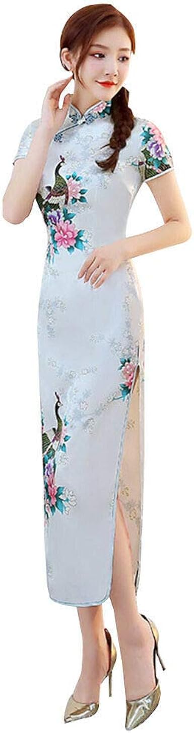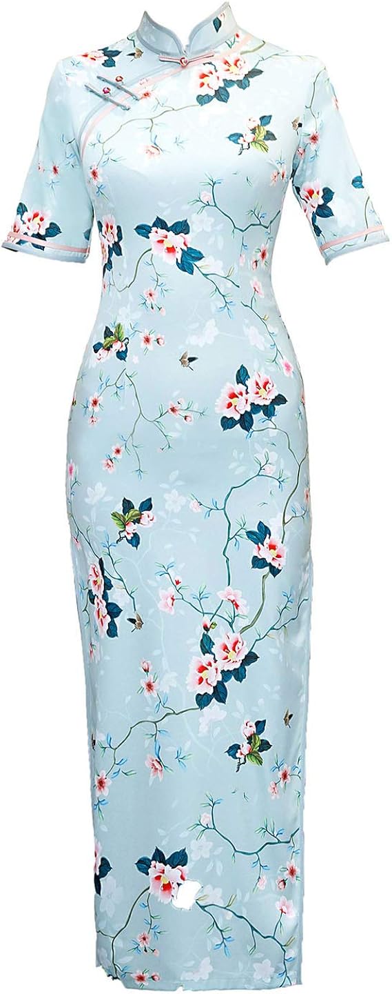Ycloth Robe Longue Chinoise Qipao Cheongsam Col Montant Manches Courtes Robe De Soiree Pour Mariage Bleu Large Amazon Fr Vetements Et Accessoires