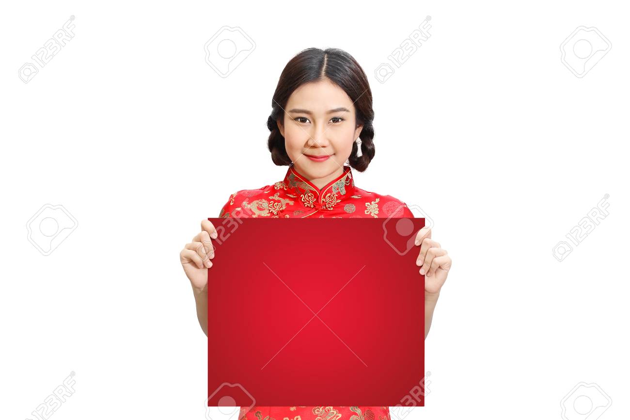 Dame Asiatique En Robe Rouge Cheongsam Qipao Tenant Un Tableau Blanc Rouge Ou Une Affiche Vierge Pour Vos Messages Et Texte Isole Sur Fond Blanc Joyeux Nouvel An Chinois Avec Un Trace