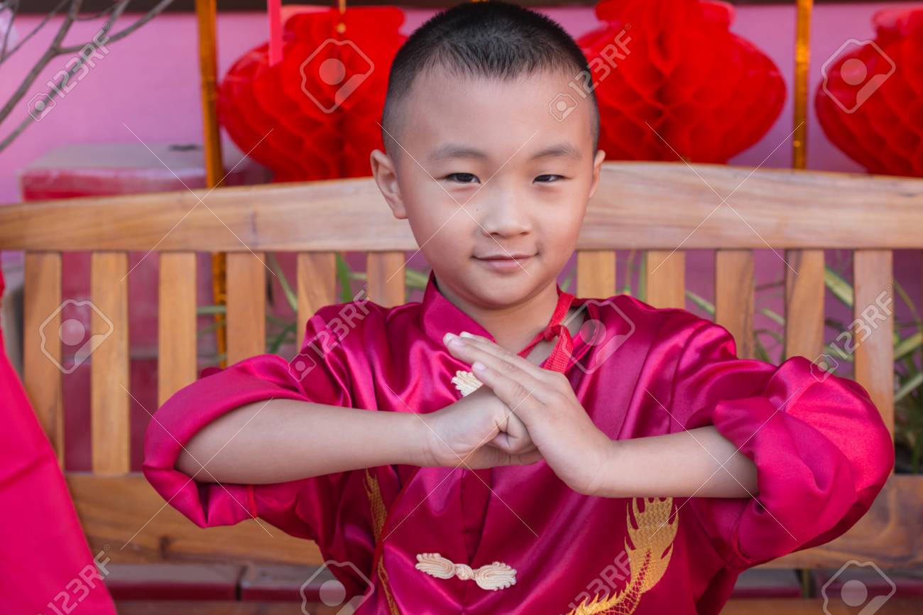 Garcon Asiatique En Robe Chinoise Rouge Pendant La Celebration Du Nouvel An Chinois Banque D Images Et Photos Libres De Droits Image 96128983
