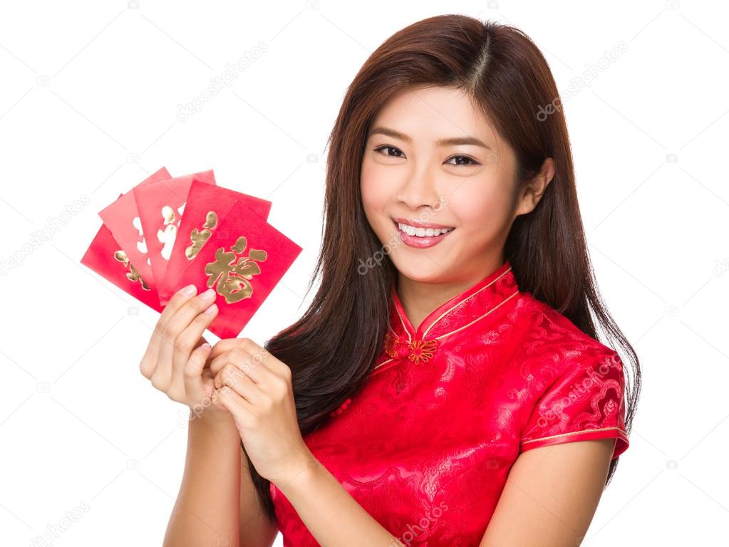 Portrait De Femme Chinoise Porter Le Cheongsam Traditionnel De Robe Et Tenir Le Bon Rouge D Enveloppe Ou De Gife Pour La Recompen Photo Stock Image Du Tenir Porter 137791540
