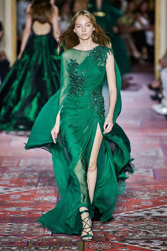Acheter Zuhair Murad Automne 2019 Couture Mode Robes De Soiree A Manches Longues Ras Du Cou En Mousseline De Soie Train Train Vert Fonce Occasion Formelle Robe De Soiree De 127 92